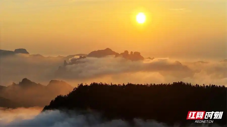 张家界国度丛林公园黄石寨景区夕阳云海景不雅。红网本领新闻4月10日张家界讯(记者 覃宵 通信员 邓道理)4月9日傍晚,张家界国度丛林公园黄石寨景区迎来绝好意思夕阳云海景不雅,金色余光与翻涌云海交相照映,勾画出一幅颠簸东说念主心的当然画卷。
