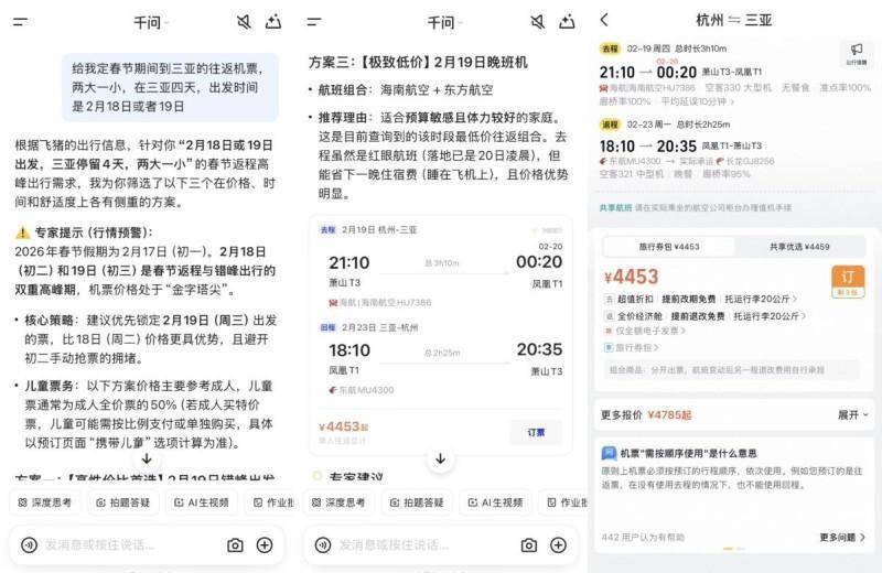 下一步预订旅店,用户不错链接在千问App输入旅店需求“住在亚龙湾,靠海、五星、含早、有儿童游乐要领”,千问也能赶紧从飞猪数据库中筛选出多家准确匹配的旅店,得志靠海需求,同期很是关爱“得当带娃”条目,保举出亲子口碑好、遛娃体验训练的旅店。用户点击卡片即可预订。