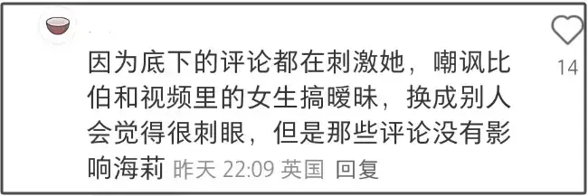 再说回到比伯的行为亦然让东谈主捉摸不透,该视频发出后海莉遭到了大批嘲讽,光讥笑她的指摘点赞大几万,外网网友吐槽“比伯和麻辣红在通盘比和海莉通盘振奋好多”,吐槽“这个男东谈主仇恨他的夫人,他对任何东谈主含笑,除了夫人海莉”,同期搀杂了几条醉心同情海莉的指摘点赞都是个位数。