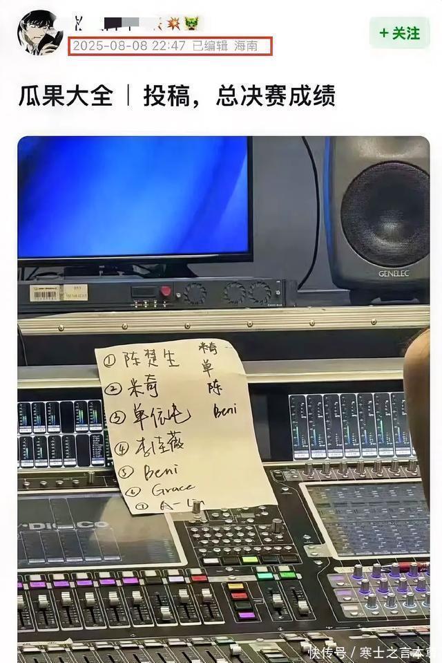 歌王总决赛时,出现的“奇幻”一幕,似乎加大了这个说法的“竟然度”。 当晚十点多,比赛还没甘休,一张疑似后台东谈主员泄露的歌王名单被疯传。