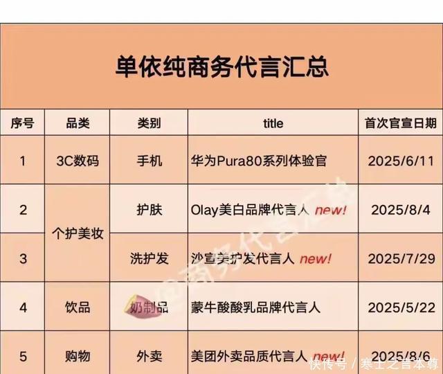 5月,蒙牛酸酸乳品牌代言东谈主。 6月,华为Pura80系列体验官。 7月,沙宣好意思护发代言东谈主。 8月,Olay好意思白品牌代言东谈主。 8月,好意思团外卖品性代言东谈主。 身价翻了三倍,博主爆料,单依纯的商演用度高达500万。