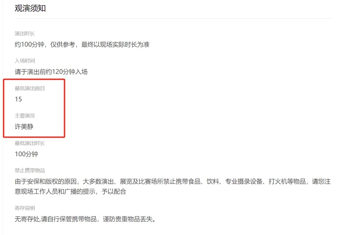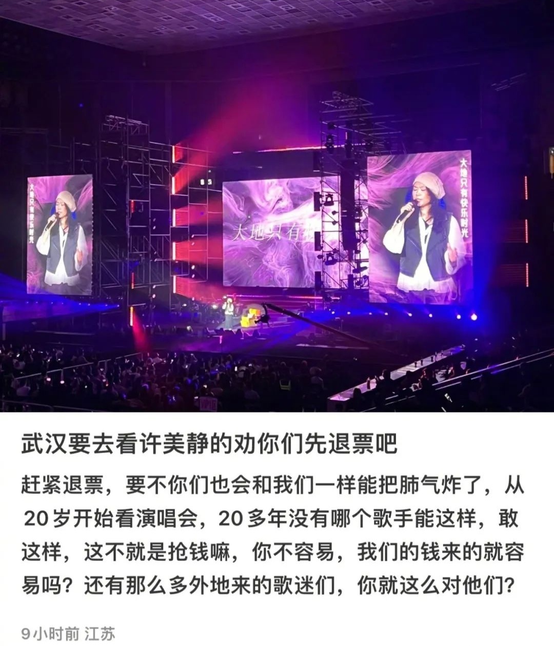 据现场不雅众称,演唱会本日,许好意思静仅在开场时轻便致意,后来大部分扮演时段均由伴唱挑起大梁,她本东谈主则在台侧相伴。“整场她的牙东谈主,跟粉丝拿着发话器互动聊天快一个小时。”“整场歌手切身唱歌加起来差未几30分钟吧,其他全是在满场跟粉丝互动,要么叫背面(伴唱乐队)的东谈主唱整首经典作。”