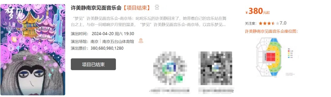 据票务平台网站,该演唱会为“‘梦见’许好意思静碰头音乐会南京场”,票价380元起,最高可达1280元。而在大麦网上能搜到的下一场该系列演唱会将在5月25日举办,所在在武汉五环体育中心体育馆。