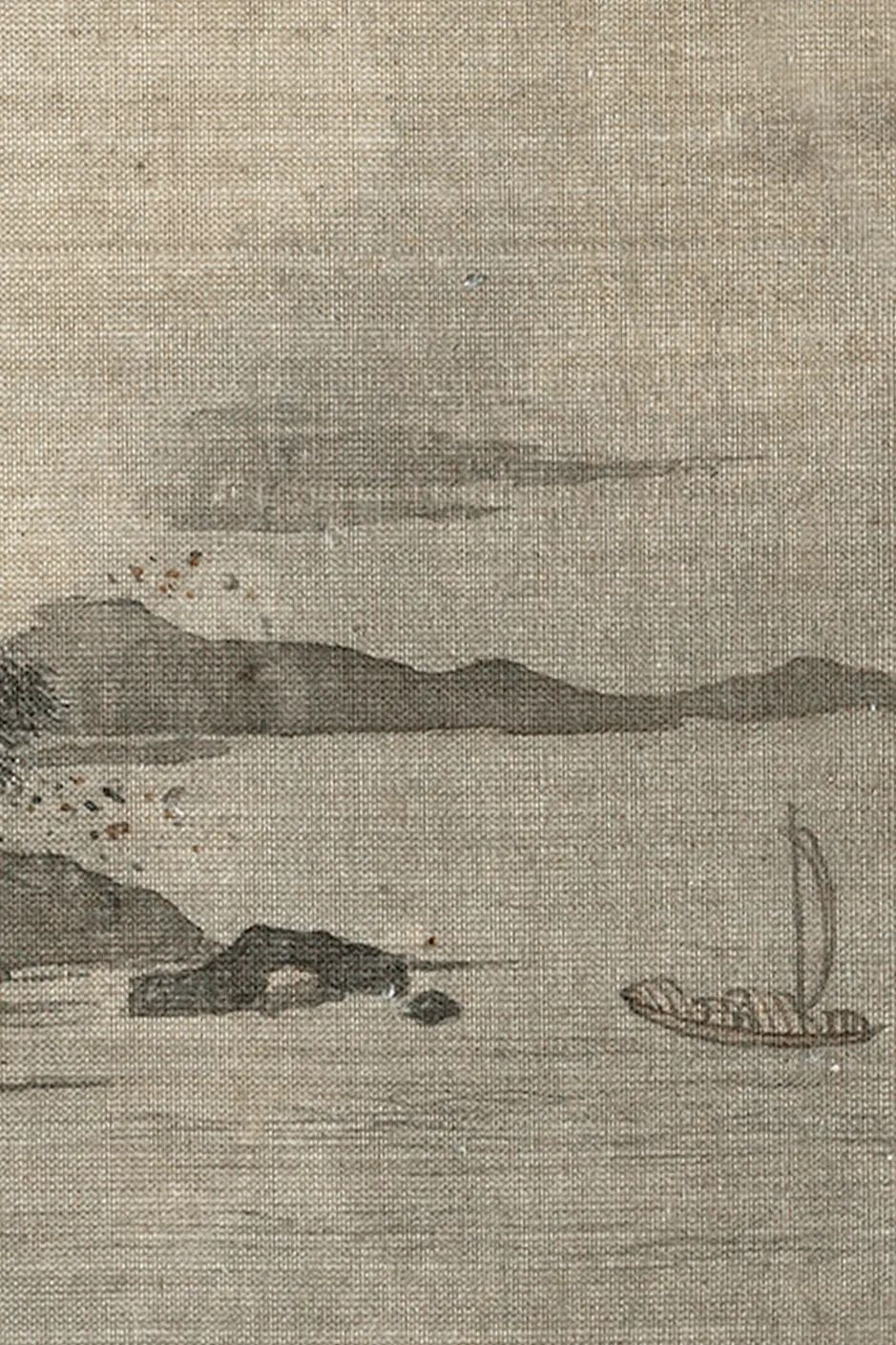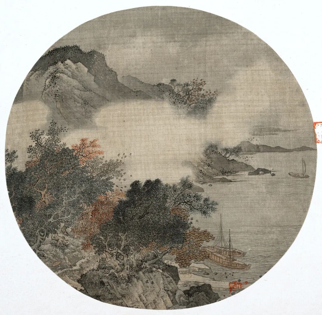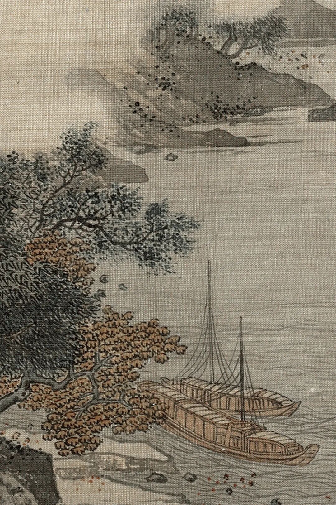 这是明代的一把纨扇小品,没留住画家名字,却耐看又有滋味。 扇面不大,方式却少许不小。 画面主打风雨江景,氛围感径直拉满。天色灰蒙蒙压下来,风雨障翳整条江面,雾气隐晦,透着清凉酣畅。江边老树枝干强盛,被风雨吹得微微弯折,把荒凉的田地衬得更浓。水面翻起细浪,水汽氤氲,一眼望去尽是飘渺落寞。 江心一叶划子静静停靠,船家收起船桨,沉静靠岸躲风雨。小小的舟船缩在山水之间,不张扬,不匆促中,自有沉静底气。 整幅画用笔从简,莫得繁复堆砌,浅浅墨色晕染风雨雾气。几笔淡墨,就画出摇风骤雨的压迫感,也画出逃一火歇
