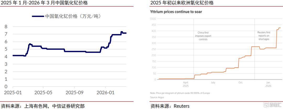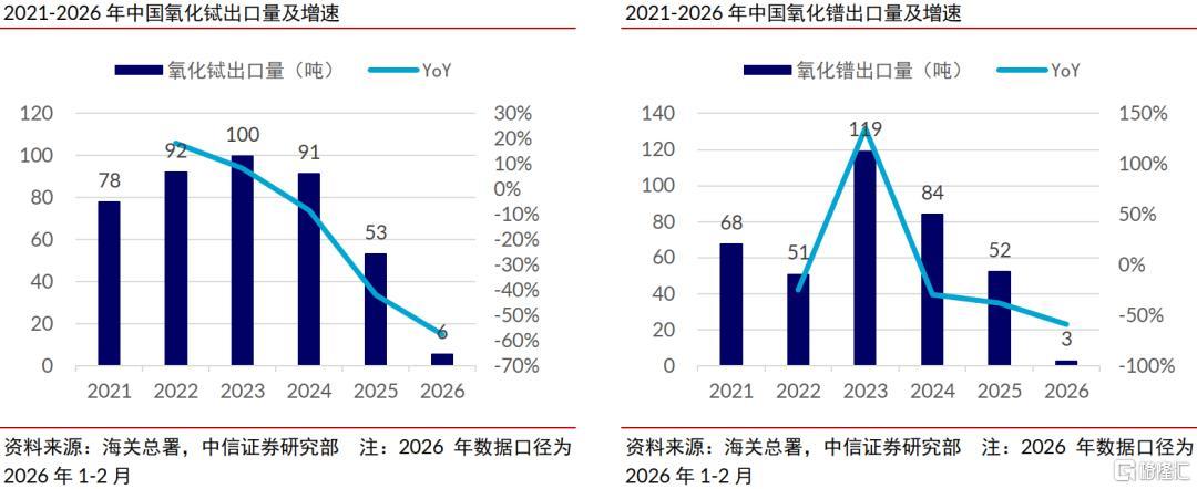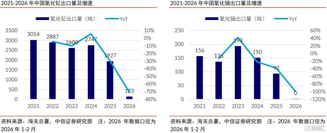 2025年以来中国握续加强稀土出口接续,部分稀土氧化物出口量大幅减少,海关总署数据披露2026年1-2月氧化钇、氧化镝、氧化铽、氧化镨的统统出口量同比减少93.8%。辩论到中国占内行稀土产量的7成(USGS数据),出口减少使得国际部分稀土氧化物缺少且价钱大幅上升,中信证券合计该情状的握续演绎凯旋利好国内相干卑鄙居品厂商,因为国际竞争敌手面对原料加价乃至断供风险,他们的市集份额和盈利才智均有望进步。