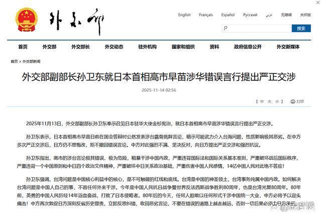11月14日凌晨2点56分,酬酢部片刻通报,酬酢部副部长孙卫东奉示召见日本驻华大使金杉宪治,就日本首相高市早苗的涉华失实言行提议严正交涉。