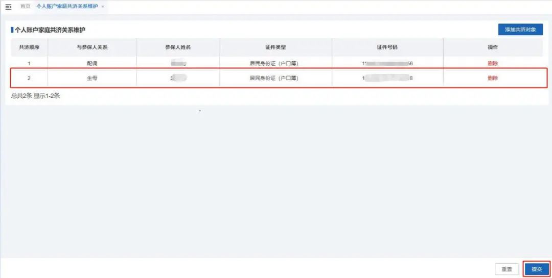 6.添加新共济对象收效后,列表会展示新添加共济对象信息,证实无误后点击“提交”按钮。