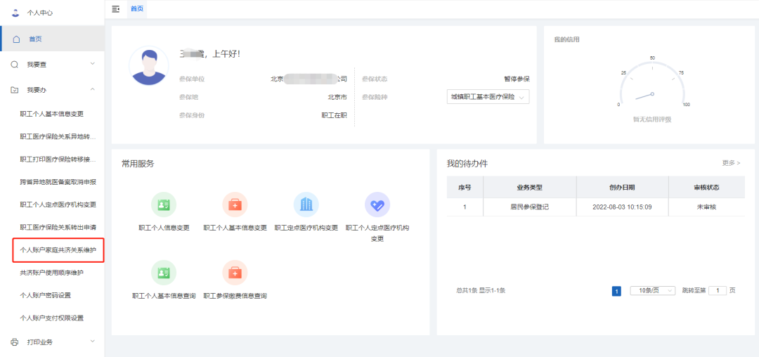 1.登录“北京医保大众办事平台”,参加“医疗保险个东谈主网厅”界面,点击左侧菜单栏的“我要办”模块,采用“个东谈主账户家庭共济辩论关心”功能。
